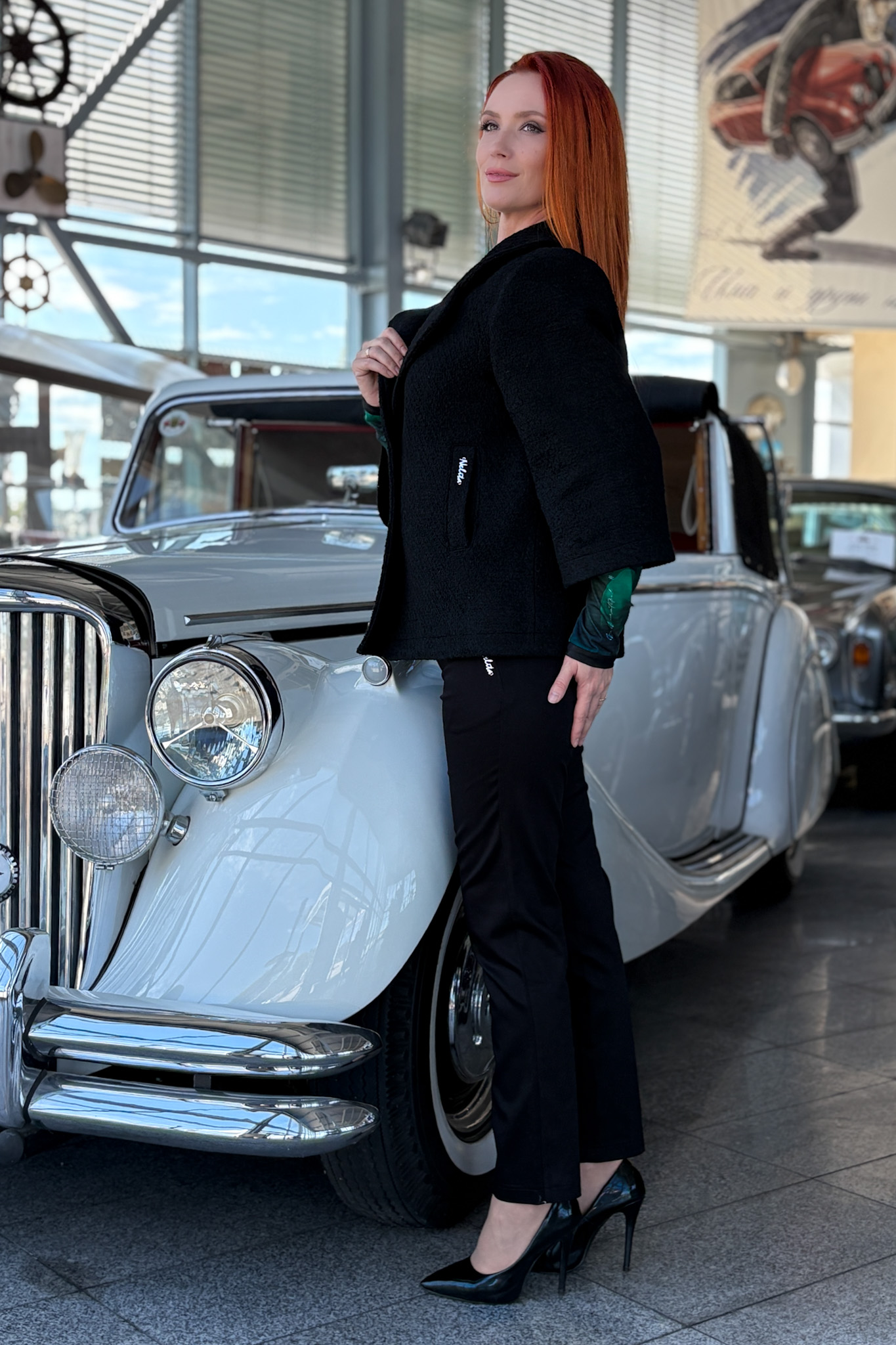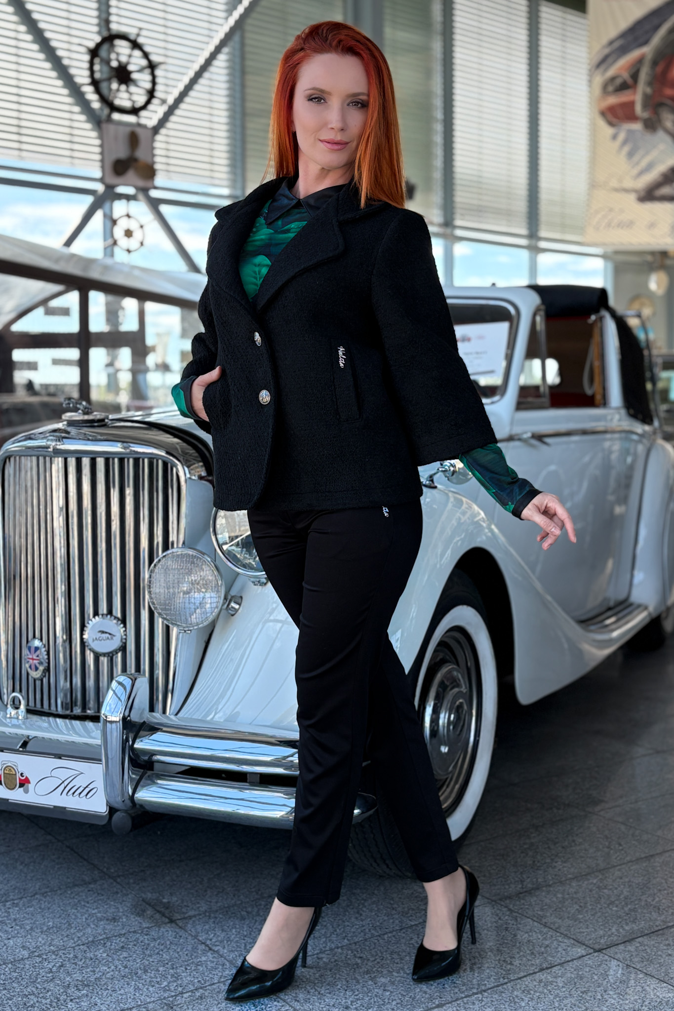 Изработено е от висококачествен полиестер с еластан, което гарантира мекота, устойчивост и лесна поддръжка. Сакото е с яка и 7/8 ръкави, придаващи модерен акцент и изтънчен силует.
