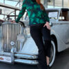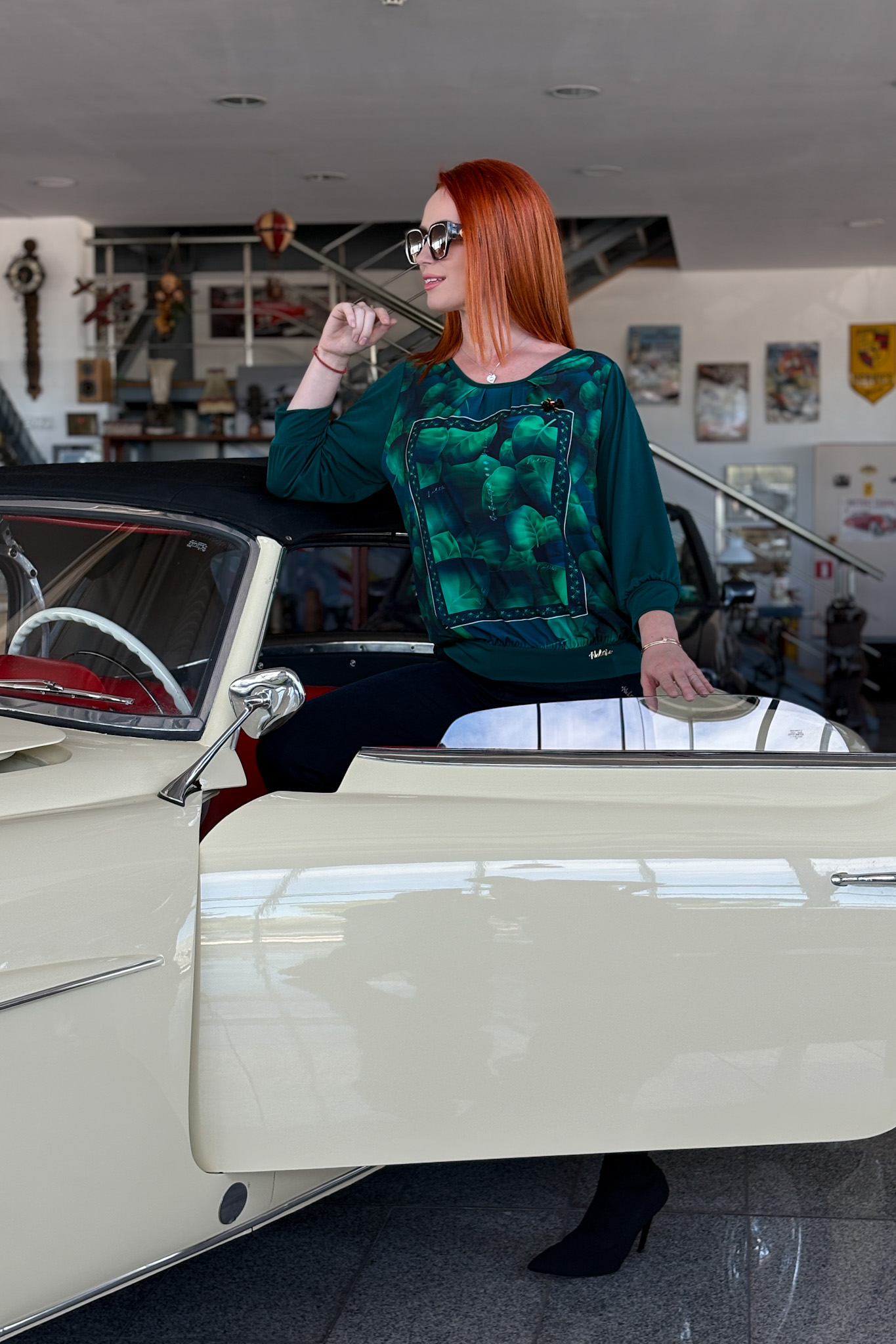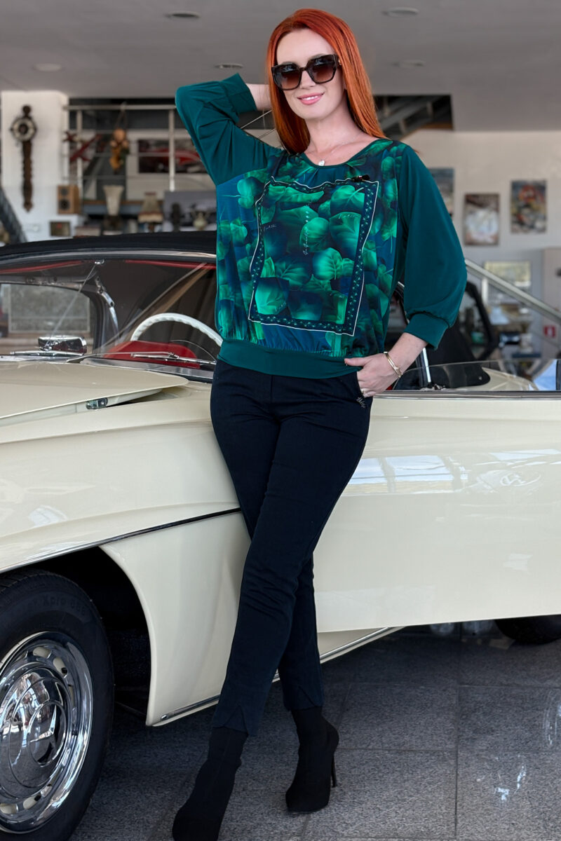 Блузата е в красив зелен цвят и впечатлява с широки ръкави 7/8, придаващи изискан и модерен силует. Облото деколте добавя класическо излъчване, подходящо както за ежедневни, така и за по-официални поводи.