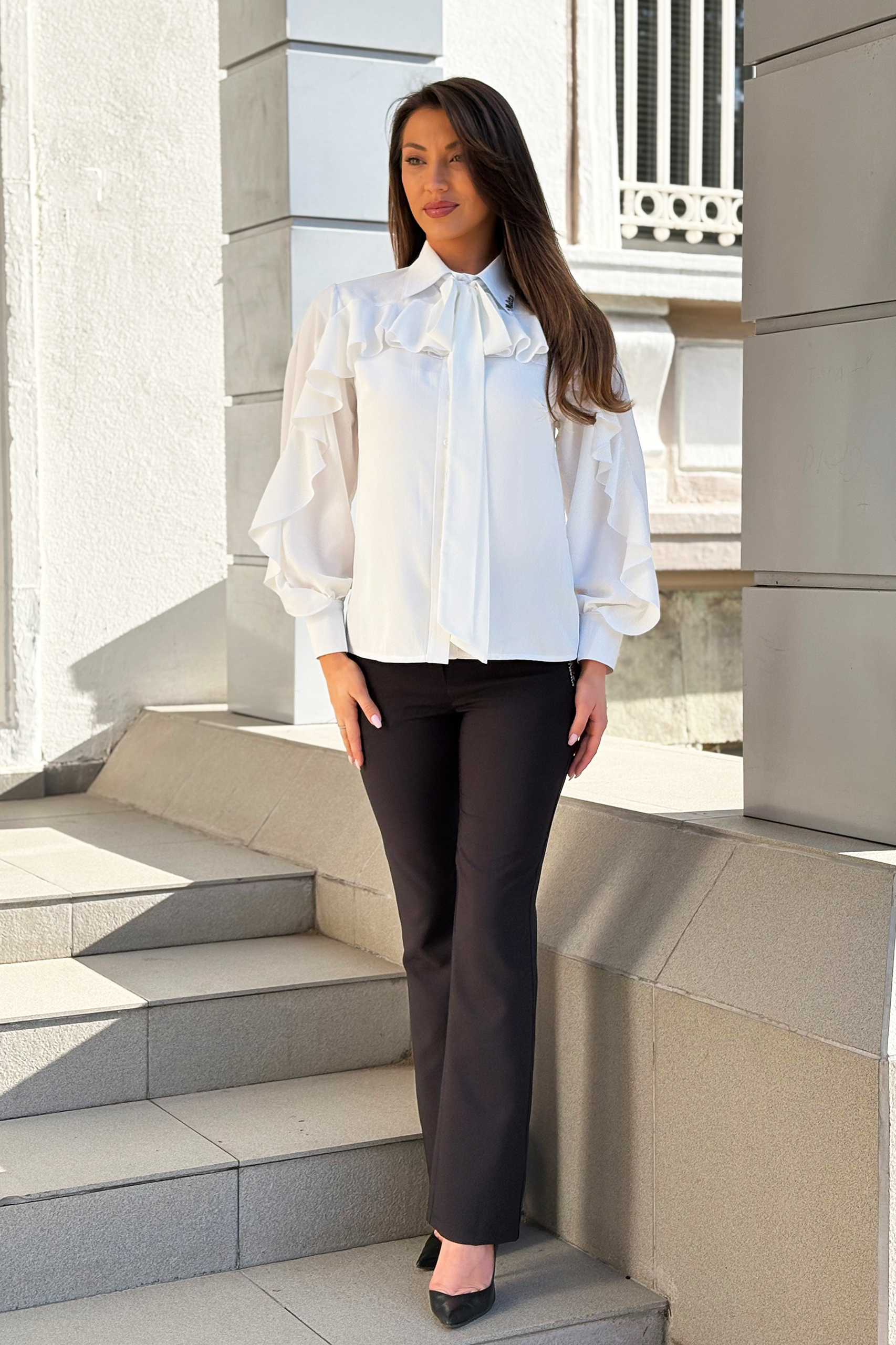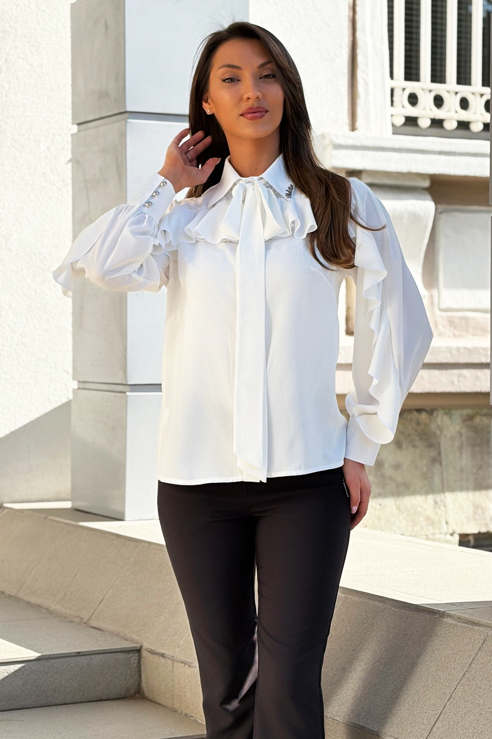 Представяме ви дамската елегантна риза в класически бял цвят, която е идеален избор за всяка дама, търсеща стил и изтънченост. Със своя елегантен дизайн, тази риза е перфектна за офис среда, официални събития или за ежедневни излизания, когато искате да се чувствате уверени и привлекателни.