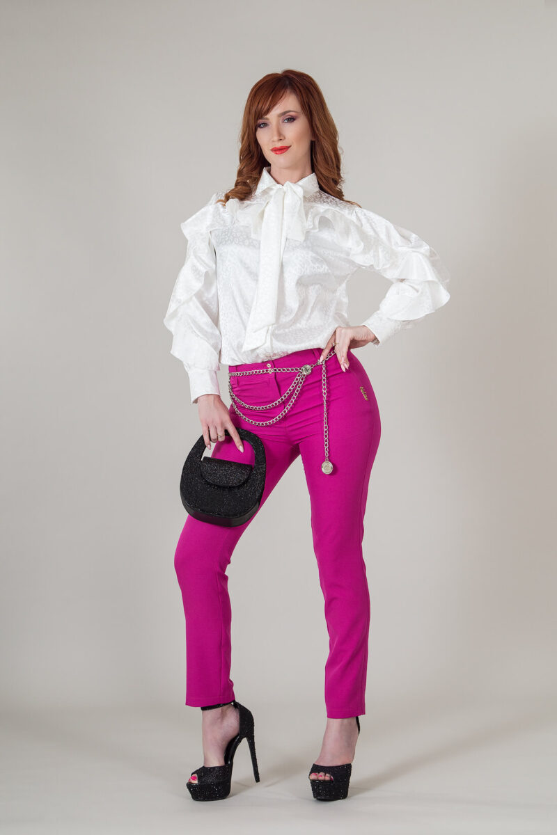 - Дизайн: Панталонът е изработен от леко еластична материя в цвят фуксия. Силуетът е прав, което придава свобода на движение и стил.