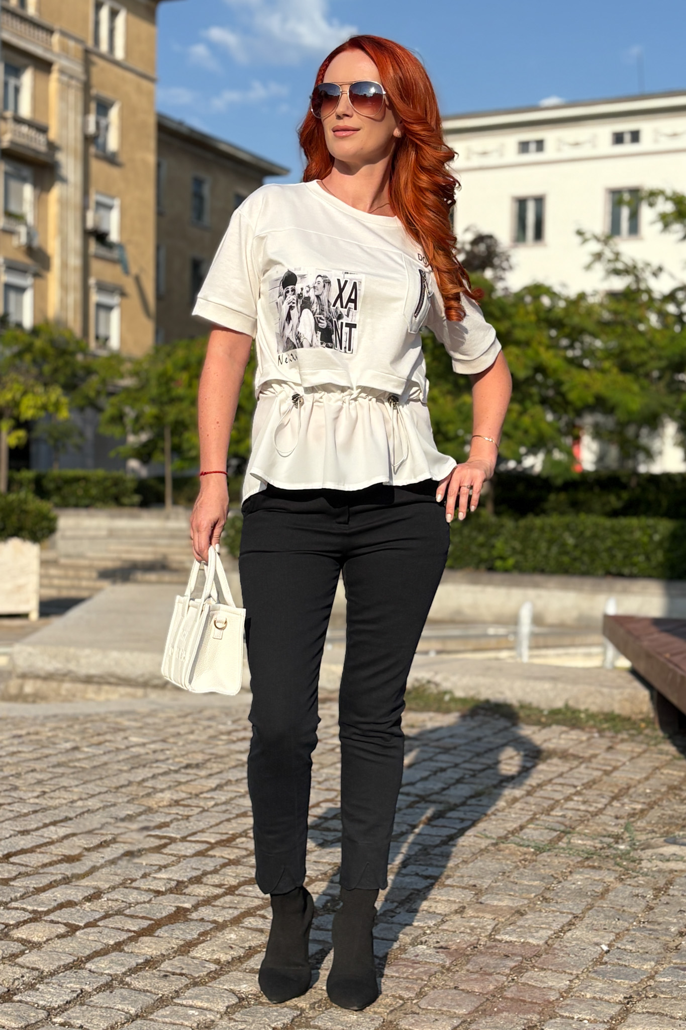 Панталонът е с нормална талия и се закопчава с копче за удобство и стабилност. Разчупен е с декоративни тегели, които придават модерен акцент и индивидуален стил.