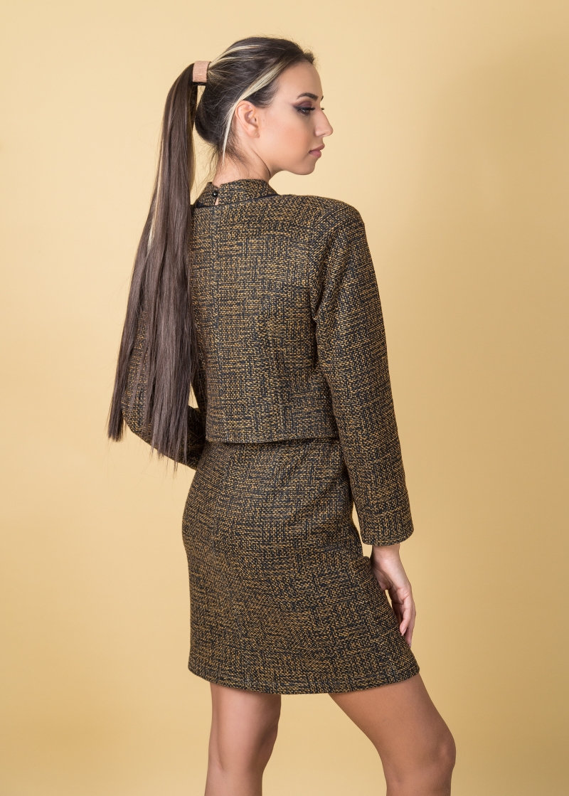Роклята е от две части-горната е от черна еластична материя,а полата е от вълнено букле със сатенирана подплата.