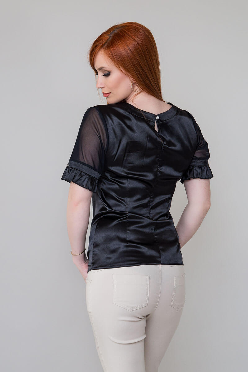 Дамската блуза от черен сатен е създадена от висококачествен материал, който приляга перфектно по тялото и е много удобен за носене. Тя има къси къдрави ръкави, които добавят допълнителен женствен акцент към цялостния й вид.