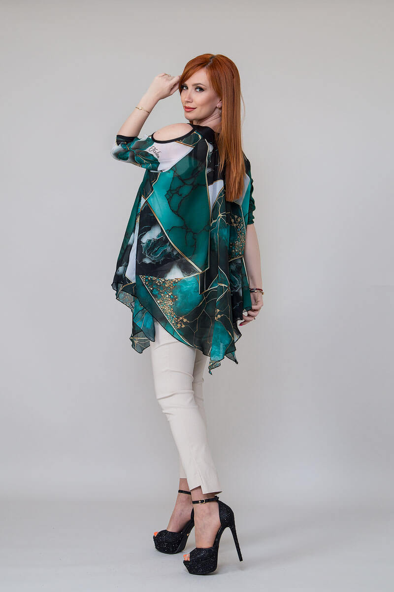 С дизайнерски принт и асиметричен модел, тази туника е перфектният избор за жени, които ценят уникалността и индивидуалния стил. Свободната кройка на туниката съчетана с голите рамене и дългите ръкави с ластичка за набор придават изящество и лекота на дрехата.