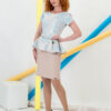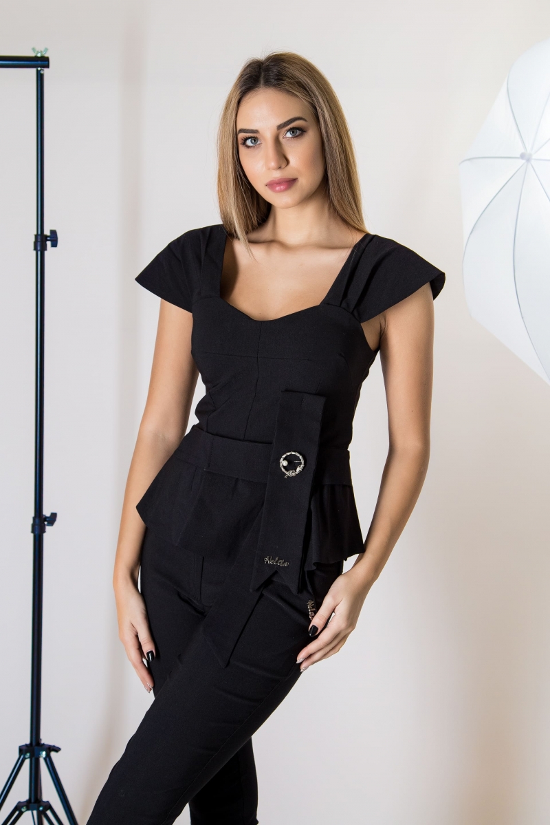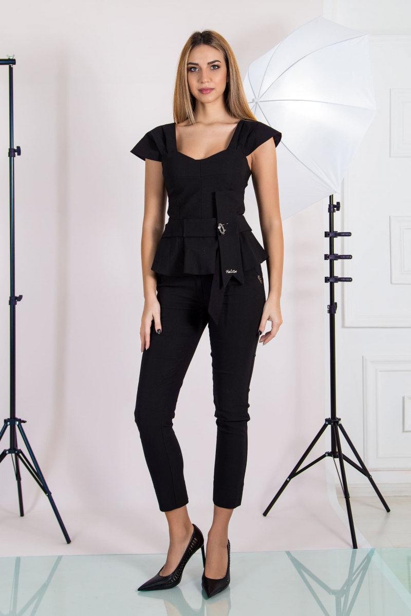 Елегантен комплект в черно.Топа е със красиви ръкави и прекрасна брошка.Има закачлива панделка в талията.Панталонът е прав и се закопчава със цип и копчета отпред.Има гайки за външен колан. Предни джобове.На задната част е със филетки.Подходящ за бизнес и празнични събития.Стои добре и на по едра фигура.