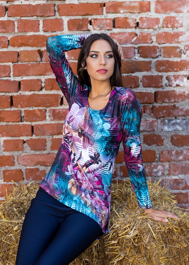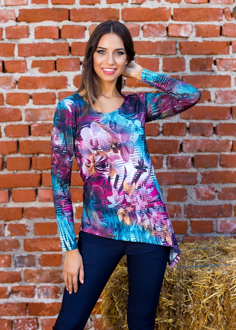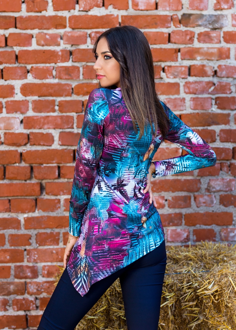 Красива и финна асиметрична туника с невероятен дизайнерски принт.Много свеж и модерен.Ръкавът е дълъг,деколтето е обло а материята приятна и еластична.Съчетана със дънки или с клин ще събирате погледи.