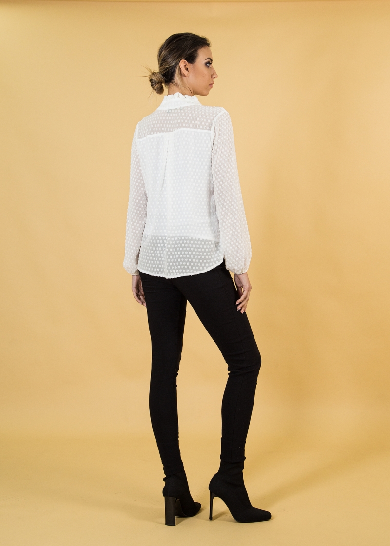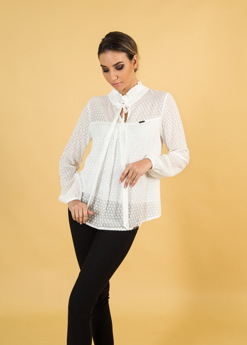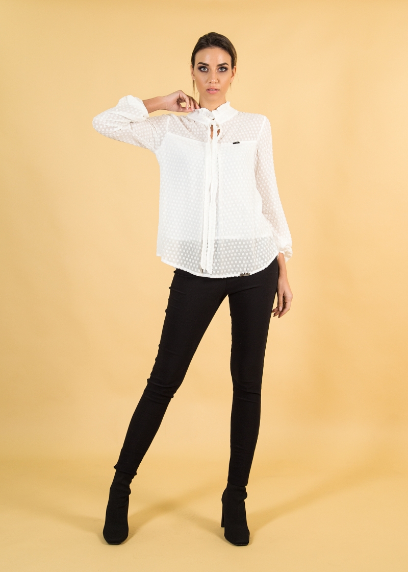 Елегантна риза в екрю. Дълъг ръкав със ластичка при подгъва. Разкроен модел. Подплата на предница и гръб за непрозрачност. Яка тип столче със малки къдрички. Завързва се на панделка отпред на яката. Сребристо бижу.