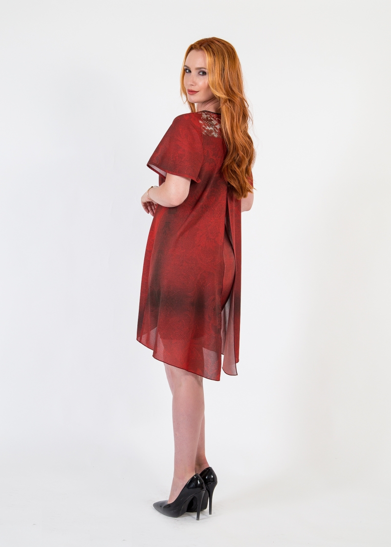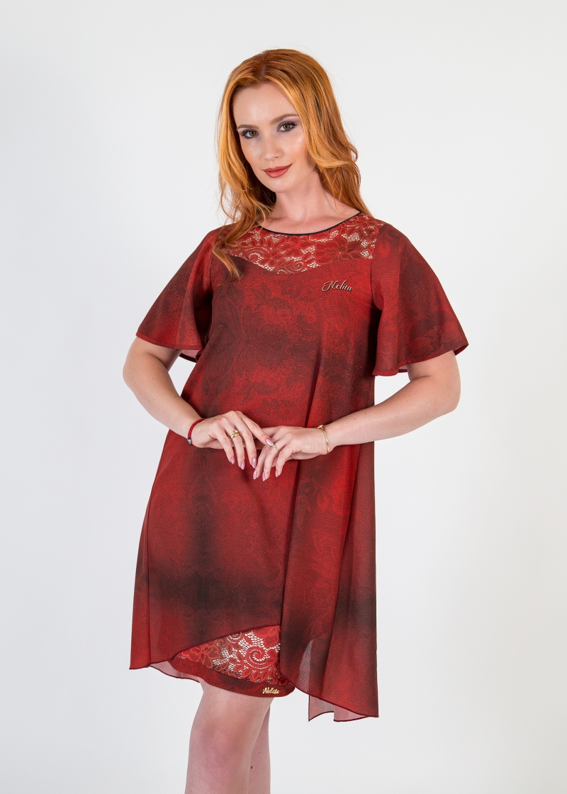 Елегантна рокля от две части.Долна част еластична приятна материя ,горна част феерична креп материя.Двете части са пришити в горната част.Ръкавите са тип камбанка.В горната и долната част дантелени елементи със телесна подложка.Закопчава се със скрит цип на гърба.Моделът е много елегантен и много удобен за изкарване на една невероятна вечер.