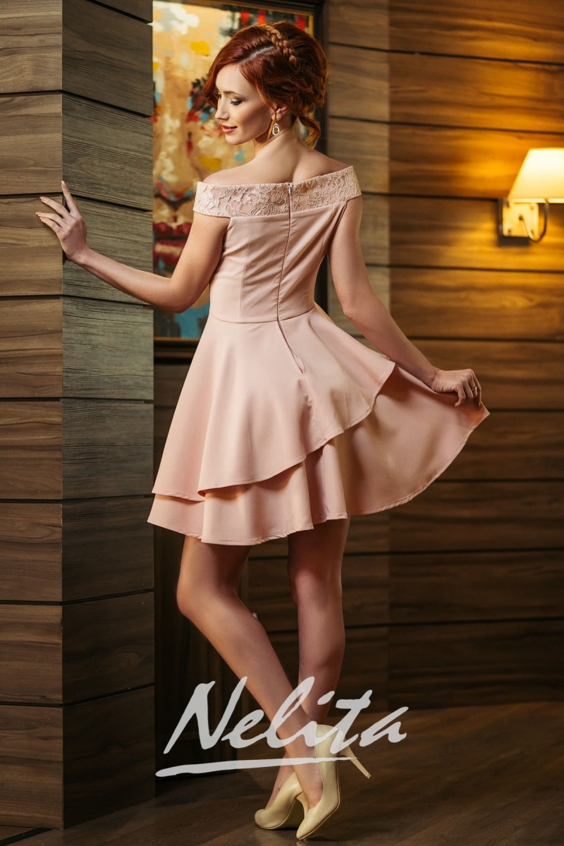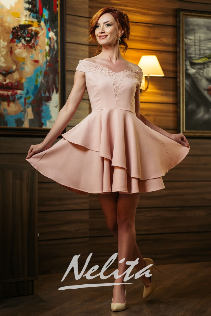 Елегантна рокля NELITA в цвят пудра със дантела. Разкроена рокля