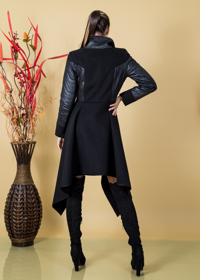Елегантно палто от кашмир в черно. Елементи от кожа-батик в черно. Предни джобове висока шал яка. Закопчава се със цип отпред. Модела е разкроен от талията.