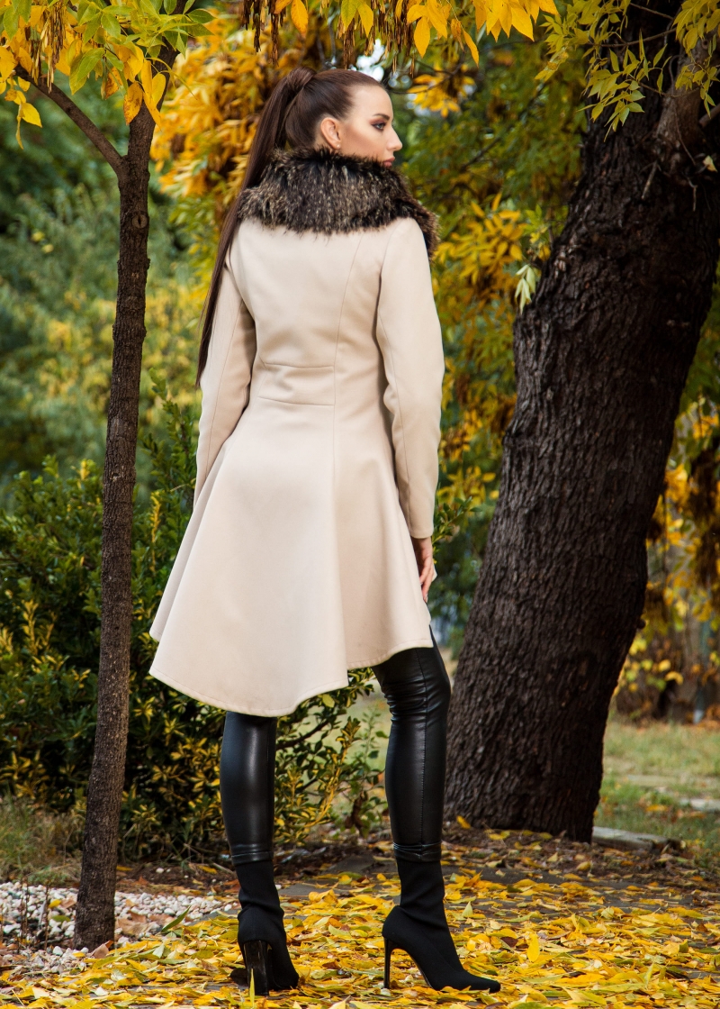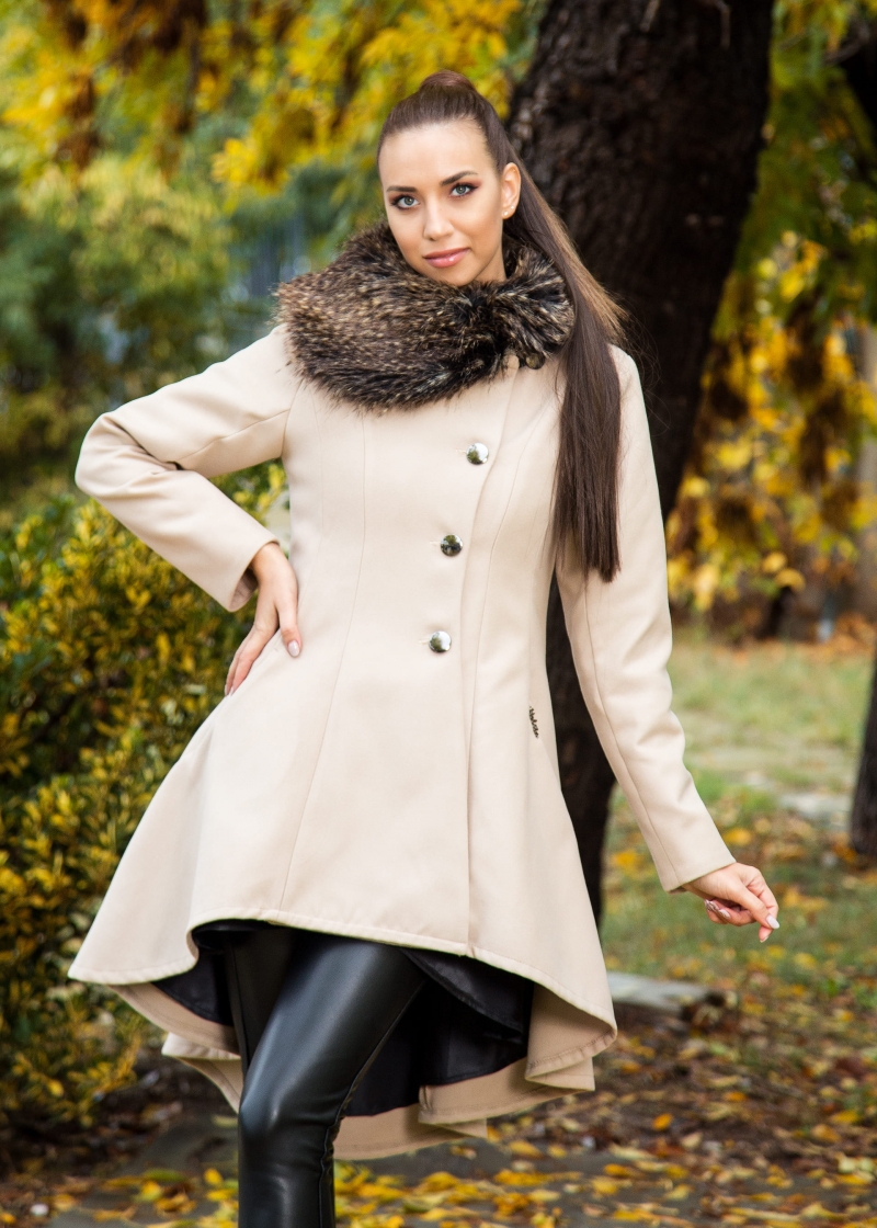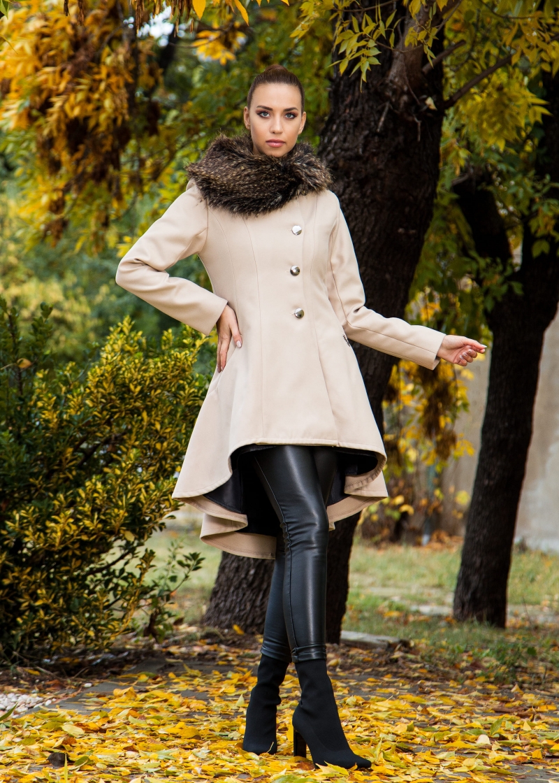 Разкроено асиметрично дамско палто в нежен цвят. Закопчава се едноредово със красиви копчета. Има джобове странично. Яка от еко косъм. Много стилно е изтънчено палто от високо качествен кашмир.