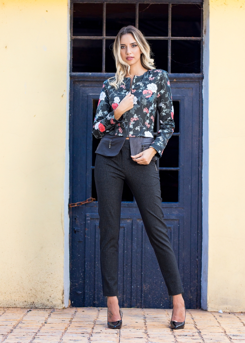Елегантен модел със красив дизайнерски принт на предната част.Гърба е от черен еластичен плат.Закопчава се със метален цип.В предната част има имитация на джобове със оксидни ципове.Хастара е луксозен сатен.Съчетава се с много модни комбинации и стои прекрасно.
