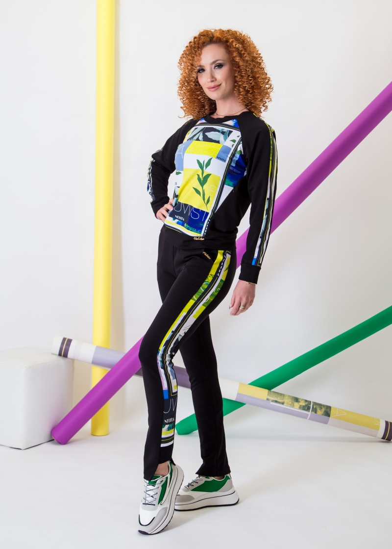Панталона е прав с кант и интересен принт съчетан със блузата