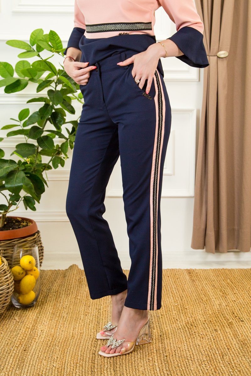 с колан и гайки, които добавят допълнителен акцент към неговия дизайн. За да издължи фигурата, панталонът разполага със страничен кант. Материята на панталона е изключително устойчива и не се мачка, благодарение на текстилния плат с еластан, който осигурява комфорт при носене. Предницата на панталона е обогатена с два тип италиански джоба, които придават допълнителен шик на модела. Закопчаването на панталона е лесно и удобно – с цип отпред и две копчета при колана.