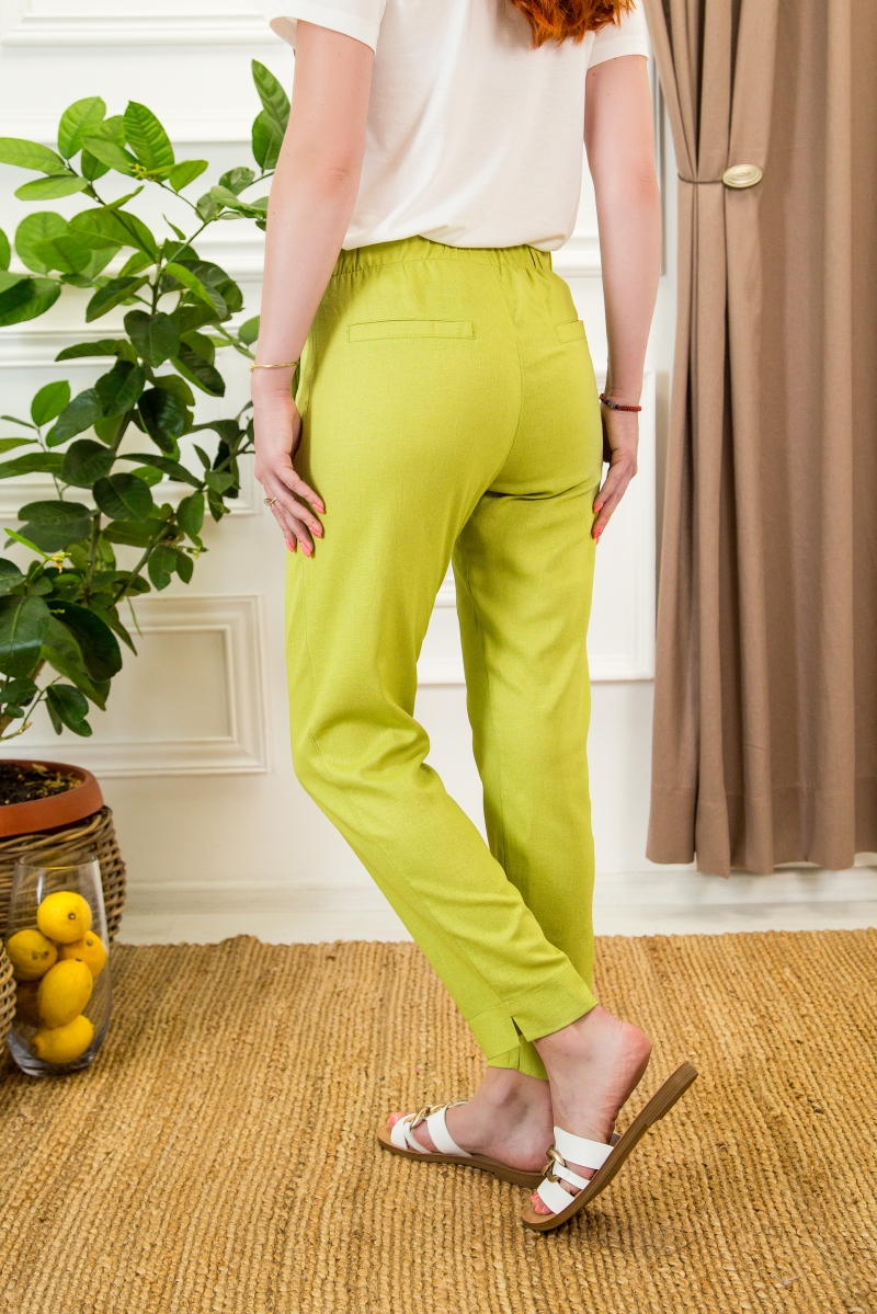 Панталона е свободен,лек модел.В предната си част има двобове със филетки и фалшив шлиц.В задната част има филетки.Колана е с ластик.Отдоло има малки цепки.
