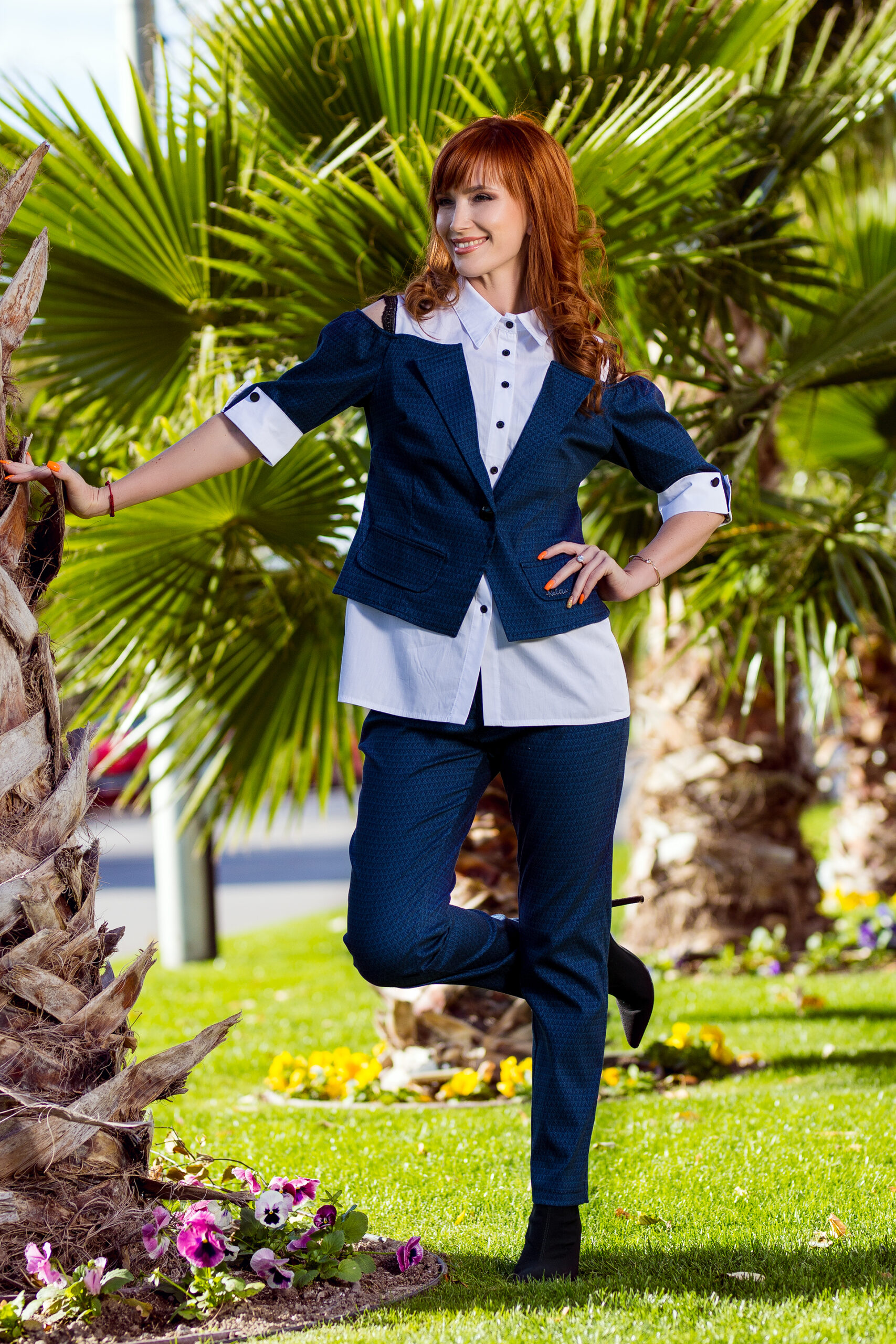 Панталон: Прав панталон с висока талия, изработен от еластична материя за максимален комфорт. Закопчава се с цип отпред, а гайките при колана позволяват добавяне на колан за допълнителен стил. Предните джобове.