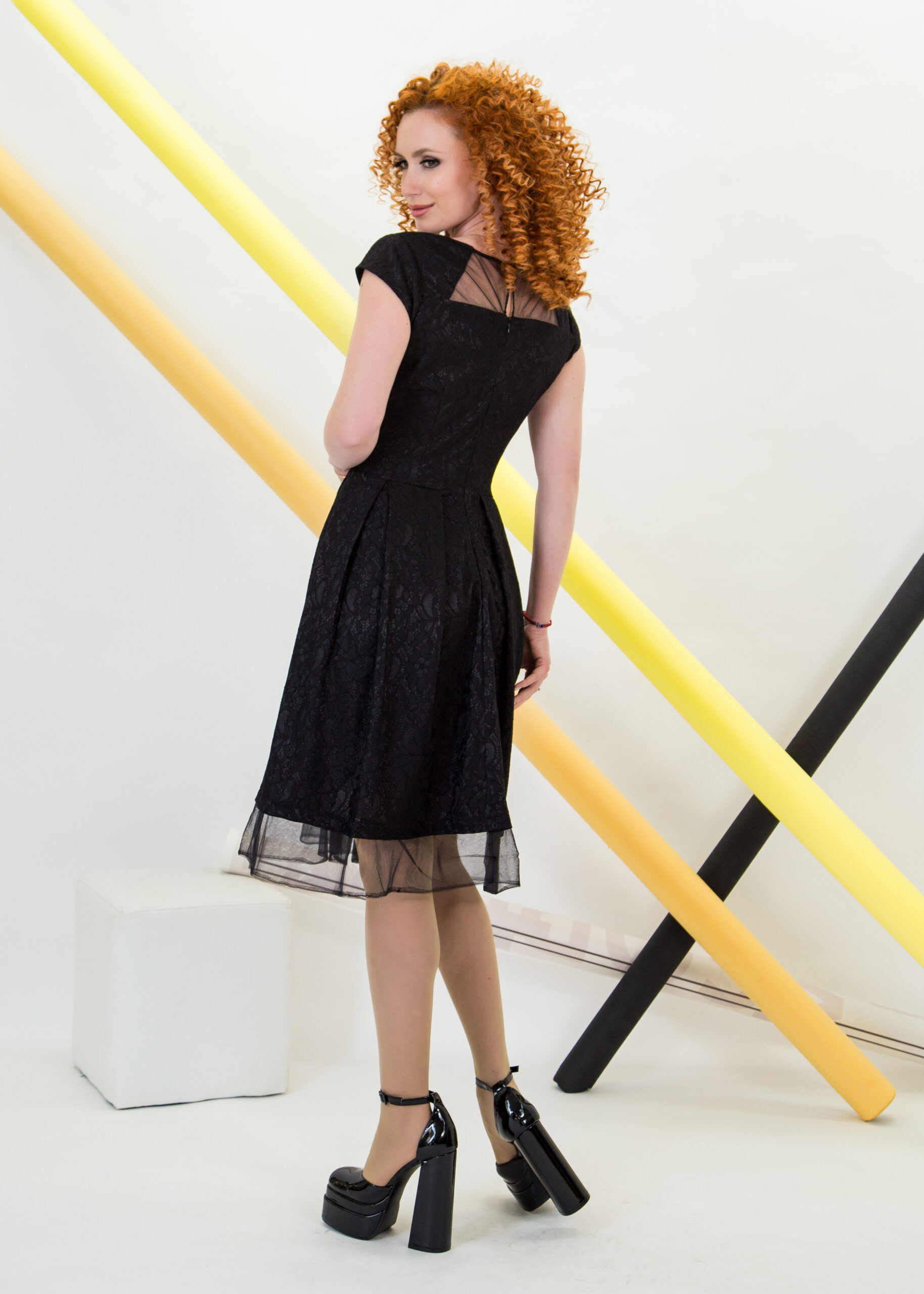 Горната част на роклята е изработена с внимание към нежната платка,състояща се от черен тюл. Задната част на роклята се закопчава със скрит цип.