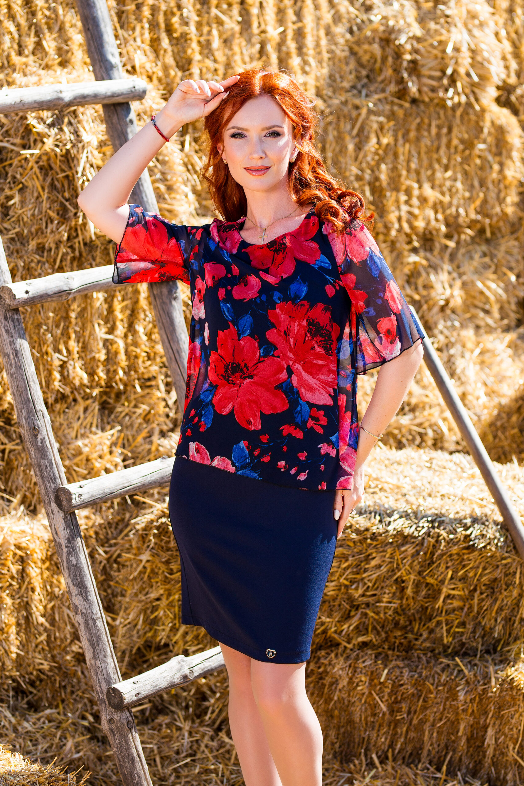 Рокля от две части с принт. Тази рокля NELITA е модерна и женствена, идеална за есенните дни. Роклята е от две части, което ви позволява да комбинирате различни цветове и модели. Горната част на роклята е от шифон – лека и прозрачна материя, която придава свежест и романтика на визията. Горната част има обло деколте, което е подходящо за всеки тип фигура. Деколтето се закопчава със скрит цип на гърба, който е дискретен и удобен. Ръкавите на горната част са тип камбанки, които са модерни и игриви. Горната част е в цветен шифон, който е ярък и модерен. Долната част на рокля NELITA е от тъмно син текстилен плат, който е плътен и стегнат. Долната част има прав силует и дължина около коляното, което ви прави да изглеждате по-високи и слаби. Долната част е в тъмно син цвят, който е класически и лесно се съчетава с други цветове. Роклята е подходяща за различни поводи, като работа, коктейл или сватба. Можете да я носите с плоски обувки, токчета или сандали, според настроението и стила ви. Тази рокля е уникална и оригинална, която ще ви откроява от останалите!