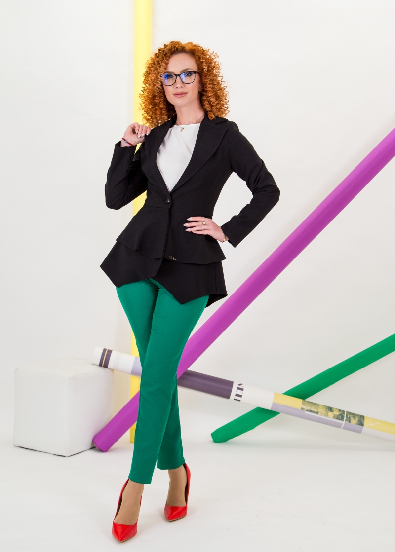 Елегантно дамско сако изработено от черен леко еластичен плат в класическа кройка