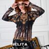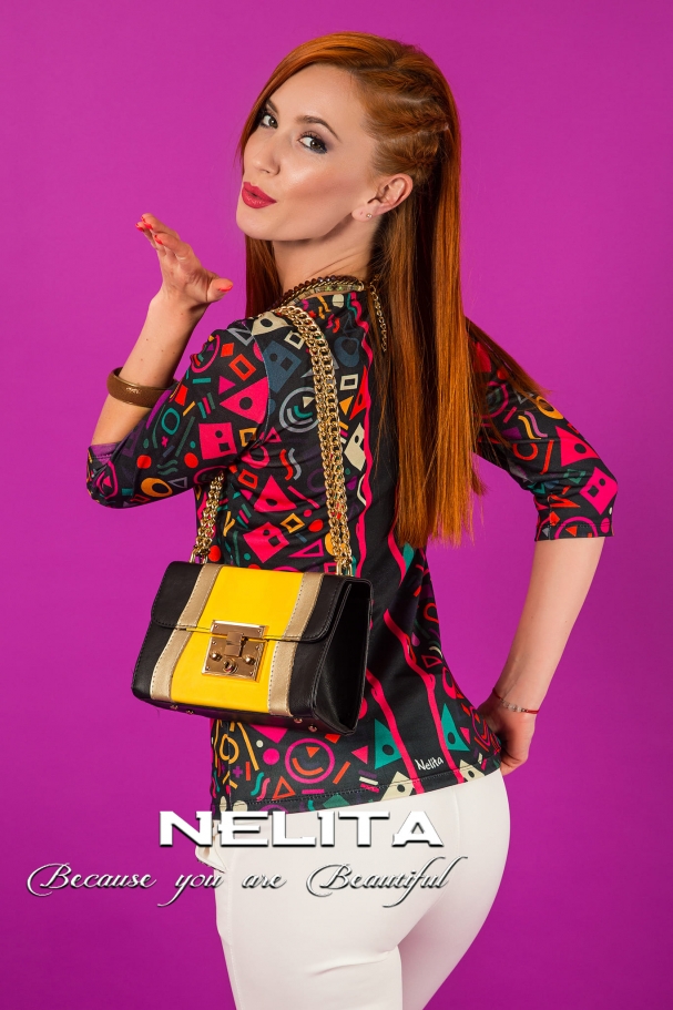 Права блуза с дизайнерски принт Обло деколте 3/4 ръкав