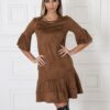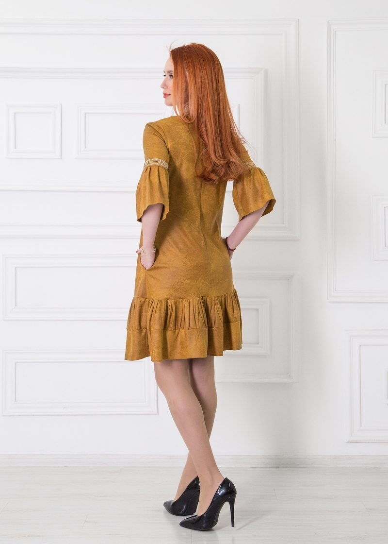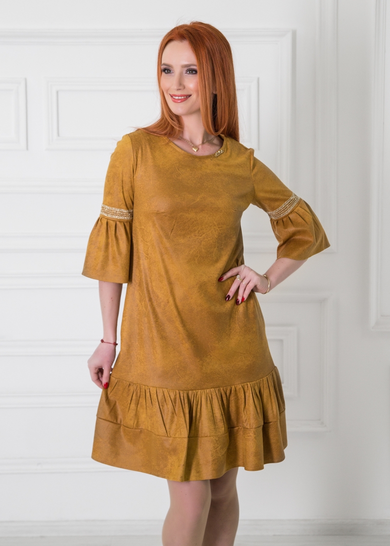 Стилна рокля с свободна кройка и ефектни ръкави обшити с златна релефна лента в долната част завършва с красиво харбале,това прави модела удобен,красив,желан.